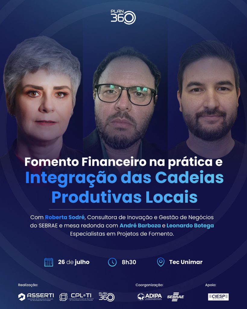 No próximo dia 26 de julho, das 8h30 às 13h30, a ASSERTI – Associação de Empresas de Serviços de Tecnologia da Informação, realizará mais um evento do Plan360, programa em parceria com a Secretaria de Desenvolvimento Econômico do governo do estado de São Paulo, no âmbito do edital de fomento da SP Produz.